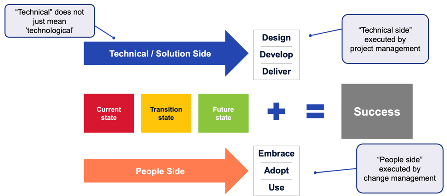 Een succesvolle verandering vereist zowel een technische als een menselijke / persoonlijke aanpak welke idealiter geïntegreerd is. Een verandering beslaat altijd de huidige, een migratie en een toekomstige situatie waarbij de menselijke aanpak minimaal net zoveel aandacht moet hebben als de technische aanpak. De technische transitie wordt via project- of programmamanagement begeleid. De persoonlijke transitie wordt via specifieke changemanagement methodieken gerealiseerd.