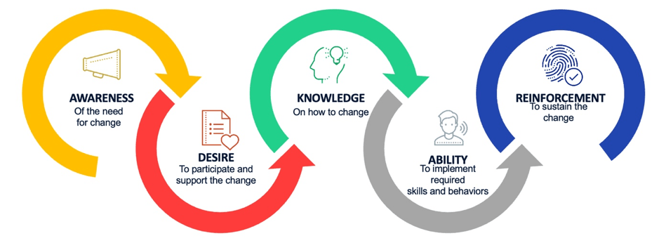 De ADKAR-methodiek is ontworpen om op organisatie en individueel niveau vijf stappen door te lopen om een duurzame verandering te realiseren. De methodiek biedt verschillende technieken en instrumenten om zowel personen als leidinggevenden te ondersteunen in het doorlopen van deze stappen en om te bepalen in welke fase de individuele personen zich bevinden.